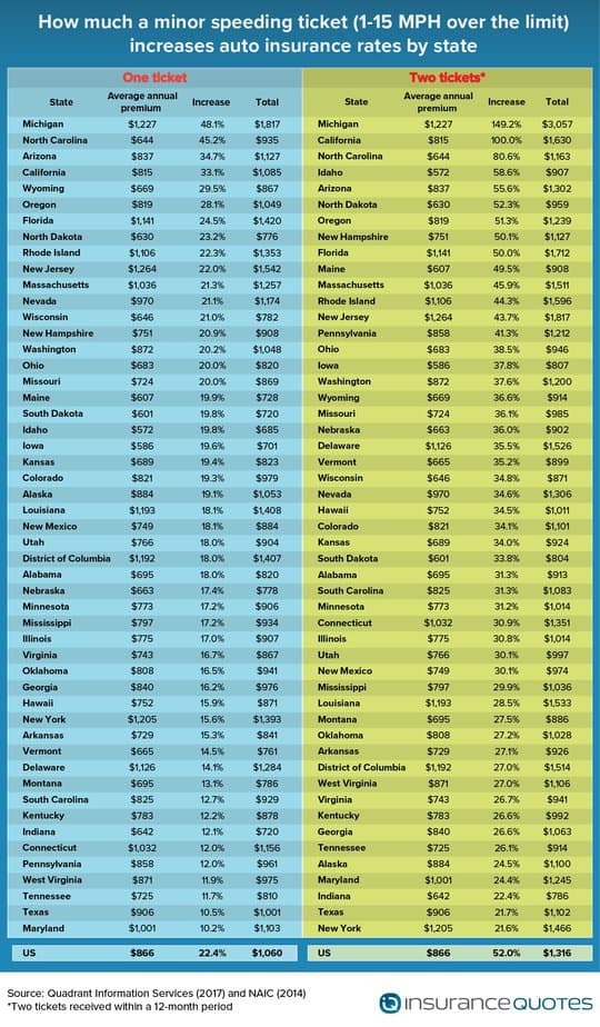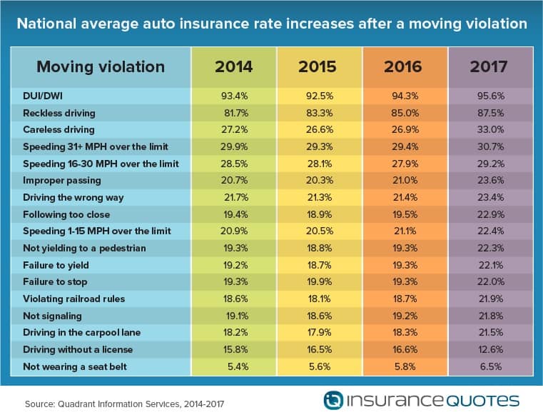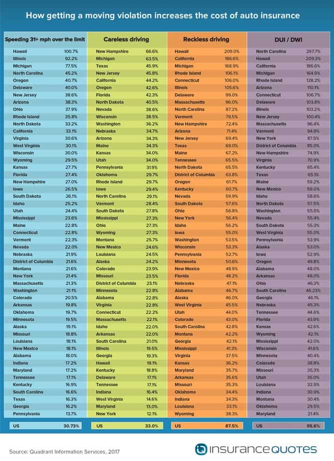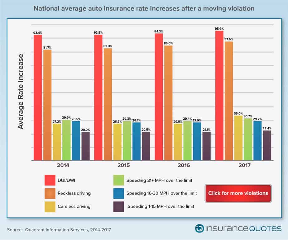 For the fourth consecutive year, insuranceQuotes commissioned a Quadrant Information Services study that found car insurance premiums can climb by as much as 96 percent after a single moving violation on average nationwide.