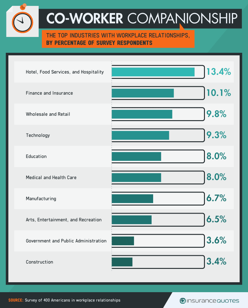 Striking the right balance in the hospitality industry can be especially difficult with long (and often unconventional) shifts, fast-paced environments, and occasionally high turnover rates. According to Americans surveyed, the majority of people in the hotel, food services, and hospitality industry were currently in workplace relationships.