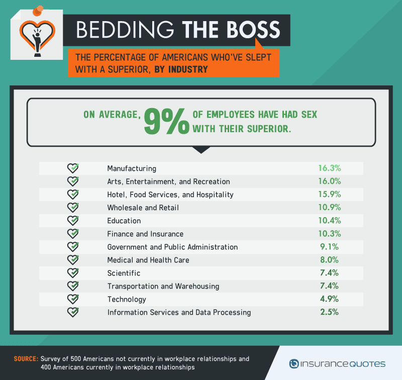 People working in manufacturing were the most likely to have slept with a supervisor, followed by those in the arts and entertainment, hospitality, and retail sectors.