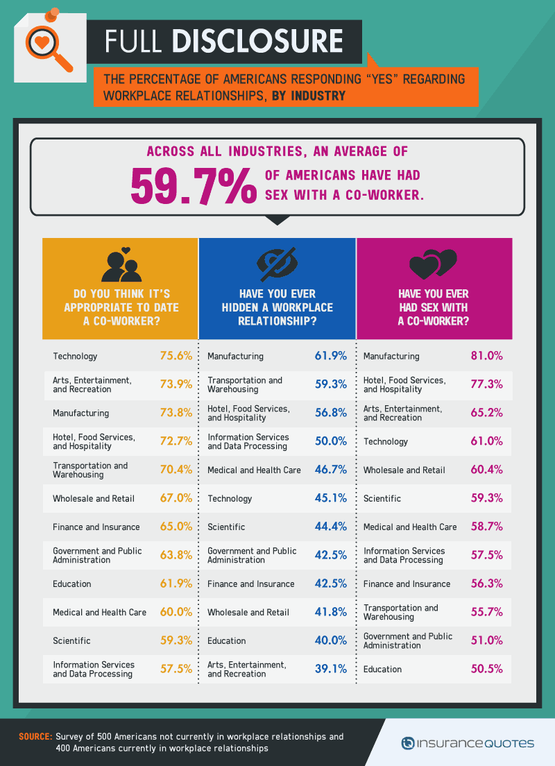 Other industries where you might find more physical relationships? Over 60 percent of Americans working in wholesale and retail, technology, the arts, and hospitality had slept with a co-worker at some point in their professional careers.