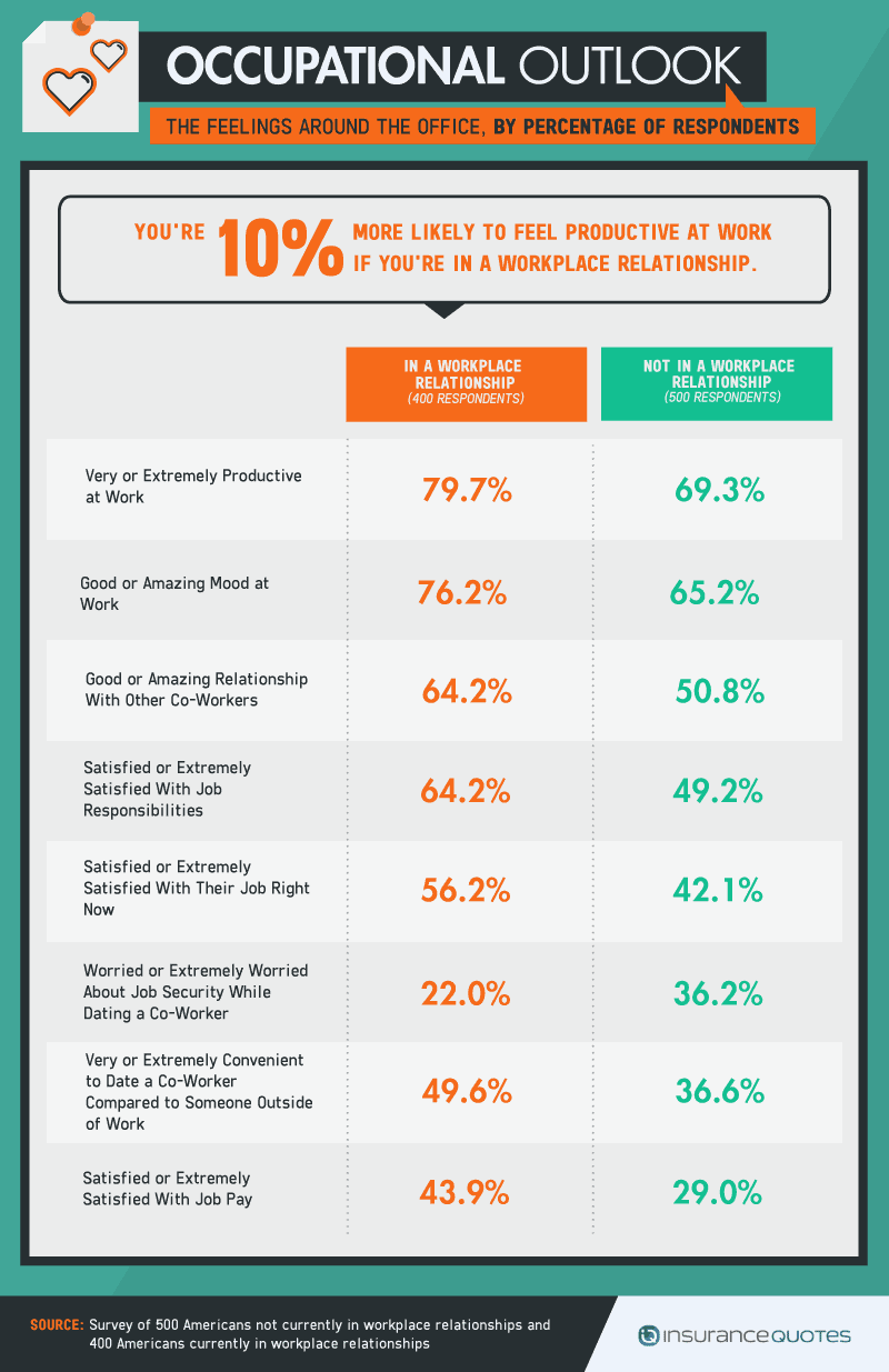According to our survey, Americans currently in workplace relationships considered themselves happier, more productive, and even more likely to be comfortable with their current rate of pay than those not dating or involved with a co-worker.