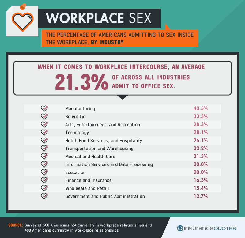 More than 40 percent of Americans working in manufacturing admitted to getting physical on the job, followed by people working in science-related jobs (over 33 percent), arts and entertainment, and technology (around 28 percent each).